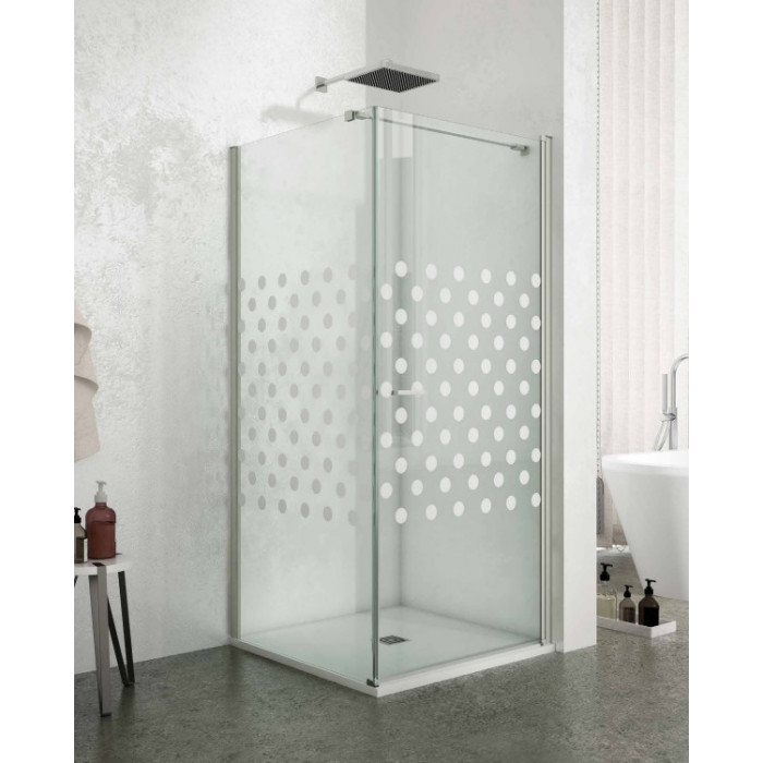 Mampara angular de 1 puertas abatibles con un lateral fijo, materiales antioxidantes, en plata brillo con posibilidad de decorar los cristales de 6mm de grosor securizados